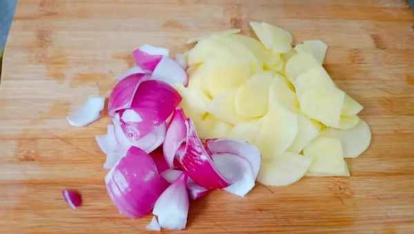 1、把土豆洗净切片,放清水中泡去多余的淀粉,红椒切滚刀块,洋葱也切滚刀块备用
