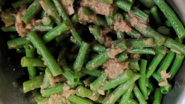 4、把控好水的豆角放入大盆中,倒入调好的麻酱汁。搅拌匀就行了。