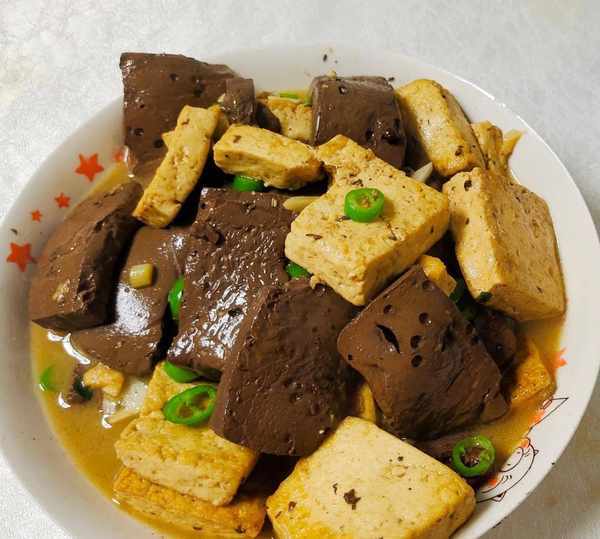 食材:豆腐,鸭血,葱蒜,青线椒,花生油,生抽,老抽,淀粉