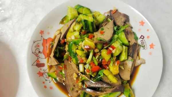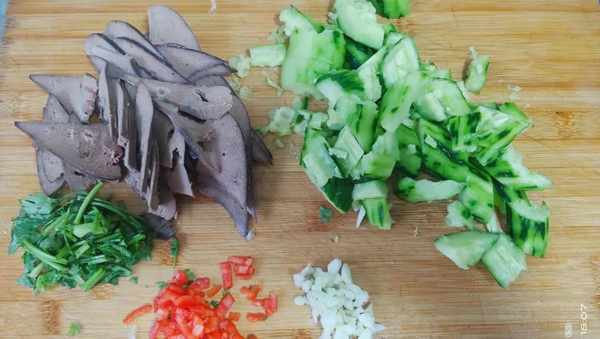 食材:黄瓜,猪肝,红椒粒,香菜,蒜末生抽,香油,香醋,鸡精,白糖,料油