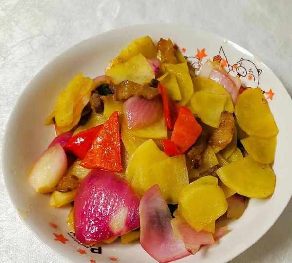 2、起锅烧油,放入五花肉,煸炒均匀,加入葱蒜片,炒出香味,再放入生抽,炒至均匀,再把红椒土豆片洋葱放进去大火爆炒,加盐鸡粉少许清水化开调料,最后从锅边淋入香醋,再放入蒜末起锅装盘