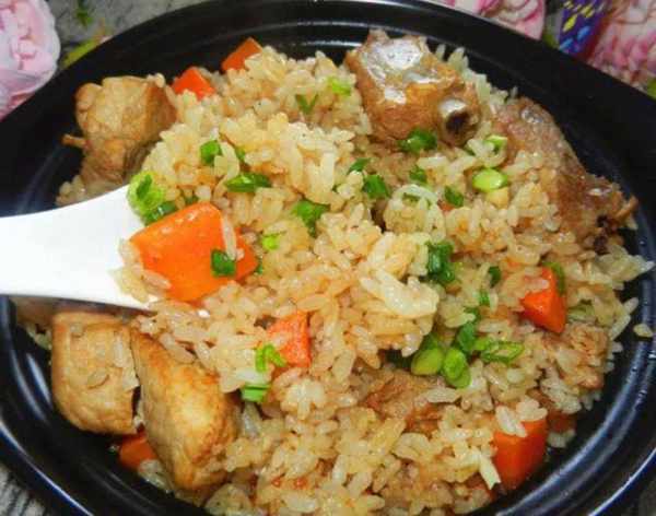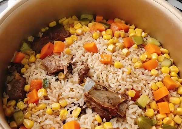 5、往电饭锅内倒入适量淘洗干净的米后,把烧煮好的排骨倒进去搅拌均匀,加入适量的清水调到煮饭煮40分钟就可以了,在撒上葱花和香菜就可以出锅了,一道香喷喷的排骨焖饭就做好了,只要一个电饭锅就可以搞定这道菜。