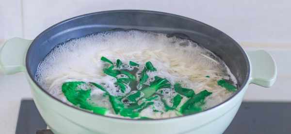 5、锅里水烧开,把面条放进来煮,煮上7分钟,再放入一把青菜叶子给它烫熟即可。