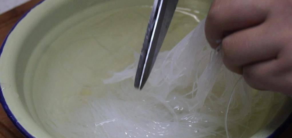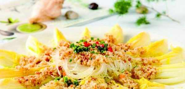 3、泡好的粉丝捞出,控干水分,然后用剪刀剪短,放到一个盘子中。盘子中首先铺上泡软了的龙口粉丝,然后将我们切成了四瓣的娃娃菜平铺在粉丝上,淋上我们刚刚调好的蒜蓉酱汁。