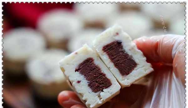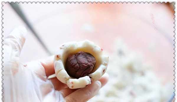 (6)取大约35g的小剂子,然后搓圆按扁,然后包上10g左右的红豆沙,包起来就好了。