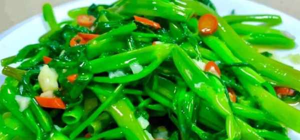3、锅内加入适量猪油,食用油,倒入料头小火炒香,倒入焯好水的空心菜,加入适量食盐,白糖,鸡精,开大火快速翻炒出锅气,就可出锅装盘,一道翠绿空心菜就做好了。