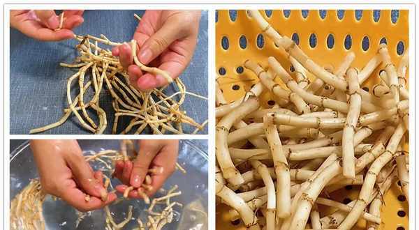 这里是鱼腥草的根茎部分,它的根茎是扁圆柱形的,看上去有些弯曲,外表是黄色,根茎上还有一些细须,一折就可以将它折断。在农村,鱼腥草都是野生的,在田头菜地里都会有,最简单的吃法就是用来凉拌,只需要简单的配料,就可以将它做得很好吃。