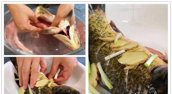 把鱼洗干净之后放在一个大碗里,切出五六片的生姜,把两片放到鱼肚子里,其它的放在鱼皮上,从里里外外把腥味去除掉。接着再切几根葱段,把葱段放进去,再倒入少一些的料酒,这样去腥的配料就搭配好了。然后可以带上一次性手套,接着用姜葱在鲫鱼身上来回摩擦几下,让它腌制均匀更入味。
