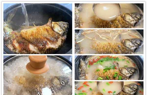 把洗干净的砂锅放到灶台上,煎好的鲫鱼放进去,加入没过鱼的开水,记得要用开水哦,因为用冷水就是刚煎好的鱼肉遇冷变柴,水量可以多一些,中途就不要去加水了。加入开水之后大火烧开,烧开之后再转为小火慢慢地炖,时间为20分钟。20分钟之后再打开锅盖,其实汤汁就已经变成浓白色了,一股香的气质扑面而来,这时就可以下入鱼腥草了,加入鱼腥草之后再炖15分钟。15分钟之后加入枸杞、葱花点缀,再加入适量的盐和鸡精调味,一锅鲜美有营养的鱼腥草炖鲫鱼汤就做好了。