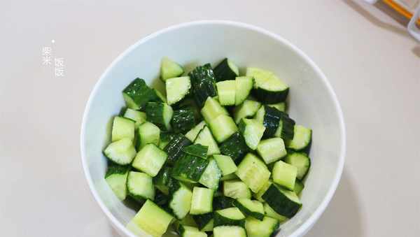 1,黄瓜洗净,切成小丁。根据菜量,加入适量的盐拌匀,腌制10分钟。