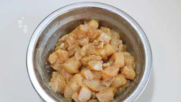 2,鸡身材肉洗净,也切成丁。然后加盐、生抽、黑胡椒粉(白胡椒粉也可以)、蚝油、淀粉,抓匀后腌制十分钟左右。