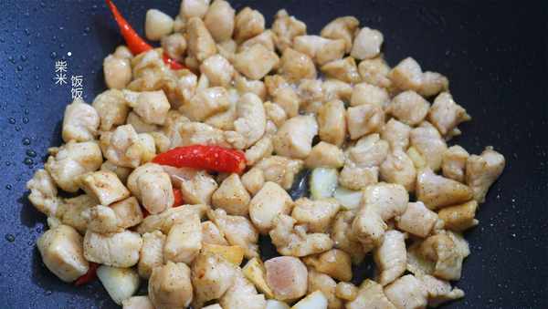 4,倒入腌好的鸡身材肉,大火快速翻炒,如果喜欢鸡肉颜色稍微深一点,可以加一点点老抽进来,大火炒至上色。注意老抽不要放多了,不然颜色不好看,也影响鸡肉的气质。