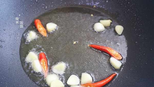 3,热锅凉油,放入大蒜、辣椒小火炒出香味。根据自己的吃辣能力,辣椒可以酌量放。当然不放辣椒也很好吃,适合孩子吃。