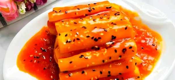 准备材料:铁山药两根、番茄酱两勺、生抽一勺、白醋两勺、白糖一勺、水三勺、淀粉一勺、盐、食用油、黑白芝麻、胡椒粉 鸡精。