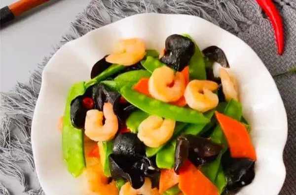 5. 锅内水烧开,依次将豌豆、胡萝卜、木耳放入焯水,捞出冷水待用。 锅内放少许油,放入姜片、蒜末炒香。 加入虾,用中火煎至虾变色。 加入煮熟的荷兰豆、胡萝卜和木耳,翻炒均匀,加少许盐调味。