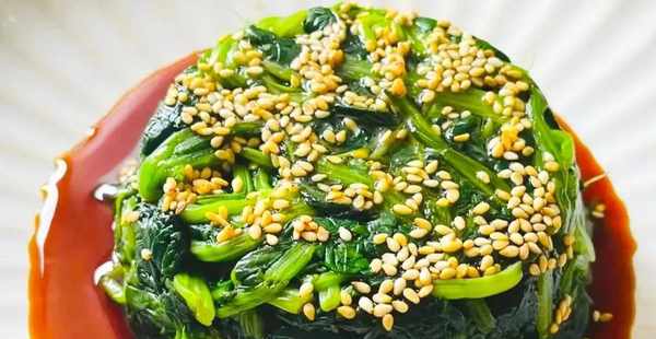 3、酱汁:淡盐2汤匙、生抽半汤匙、蚝油少许、糖少许、水和白芝麻少许,搅拌均匀后撒在菠菜上。 最后滴点香油提升香味~