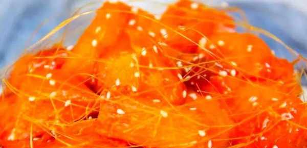 4.用勺子把锅里剩下的一些糖汁倒出来。 勺子在家里应该是椭圆形的。 用尖端把糖汁往下滴。 一定要趁热倒出来,再倒凉一点。 , 这时候可以拉拉丝,把它包在红薯上。