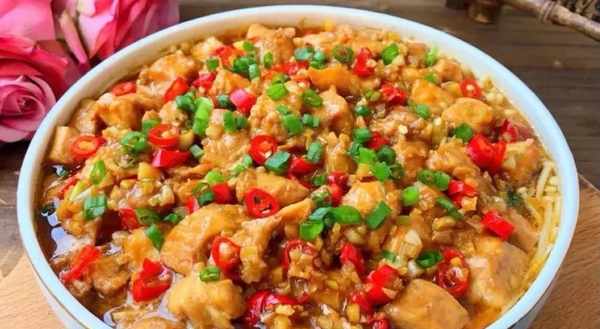 材料:金针菇100克,鸡身材肉200克,蒜姜片10克,小米椒丁适量,葱花10克。