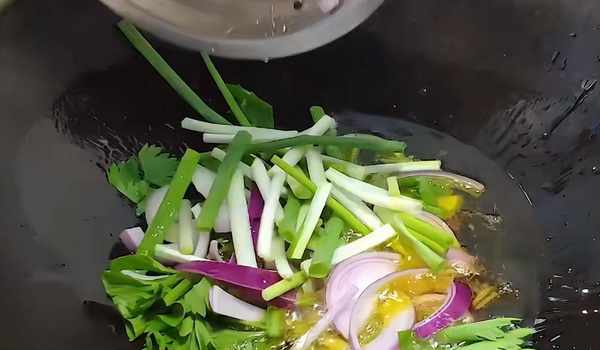 3、 锅内放入小半碗油,烧到八成热时,倒入葱段、洋葱丝、芹菜段、大蒜块,花椒、香叶小火慢炸,炸至微焦捞出,将油装碗。