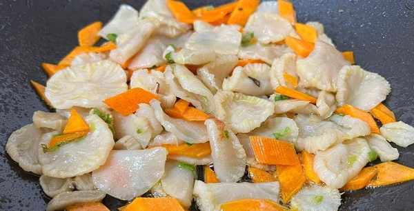 2、起锅烧油,放入葱花爆香,先倒入胡萝卜,加少量味极鲜提味,炒至变软,再倒入莴笋干,大火爆炒1分钟左右就熟了。因为莴笋本身就是焯水的,很容易熟的,出锅前加适量盐,翻炒均匀,关火盛出,一盘美味的清炒莴笋干就做好了,鲜香可口,超级下饭。