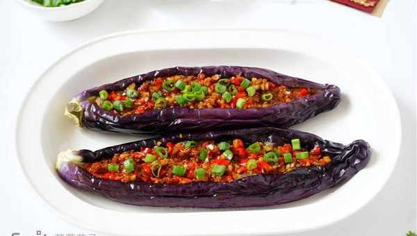 1、茄子去蒂洗净,锅中加水烧开,放入茄子中火蒸10分钟左右蒸熟。
