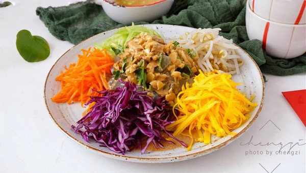食材:黄瓜、胡萝卜、紫甘蓝、鸡蛋、绿豆芽,东北拉皮