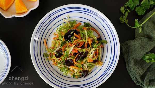 6、把木耳、虫草花攥干水分放入盆中,苦菊也放进来,倒入小碗中的调料汁搅拌均匀即可。