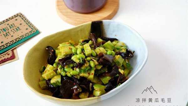 6、把黄瓜、木耳、毛豆豆放入盆中,加入蒜末、香菜,加盐1小勺,加白糖1/2小勺,生抽、香醋各1汤匙,再根据个人口味加点辣椒油和香油,搅拌均匀即可。