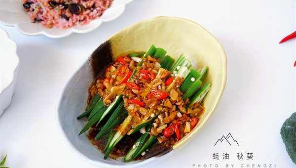 6、最后将炒好的调料汁浇在秋葵上,吃之前搅拌均匀即可。