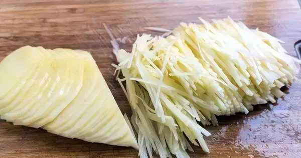 1.首先准备黄皮土豆一个去掉外皮,然后给它切成厚厚的薄片。最后给它切成细丝,放在清水中给它多冲洗两遍,控干水分放入干净的碗中备用。