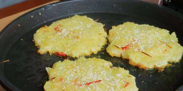 3.油热后把准备好的土豆面饼生胚放在上面,上面撒上少许的黑芝麻。盖上盖子烙至五分钟就可以出锅食用啦。用这个方法做出来的土豆丝饼,营养美味又解馋。喜欢的朋友赶紧去试试吧!