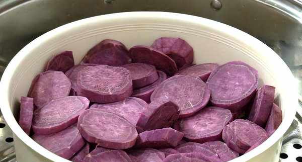 1.首先准备新鲜的紫薯两个去掉外皮,然后放在清水中给它冲洗干净。切成厚厚的薄片,开水上锅蒸15分钟。15分钟后用筷子插一下紫薯的中间,如果能轻松地插透就在这紫薯蒸好啦。