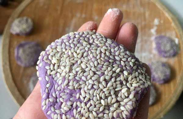3.面粉30克,糯米面50克放入碗中。在里面加入适量的清水。用手揉成光滑的面团。每个面团分成大小均匀的剂子,然后把这个紫薯球包裹起来。用手压扁。做成小饼的形状,电饼铛预热刷上一层食用油。把准备好的生胚直接放在上面。上下煎制五分钟就可以出锅食用了。