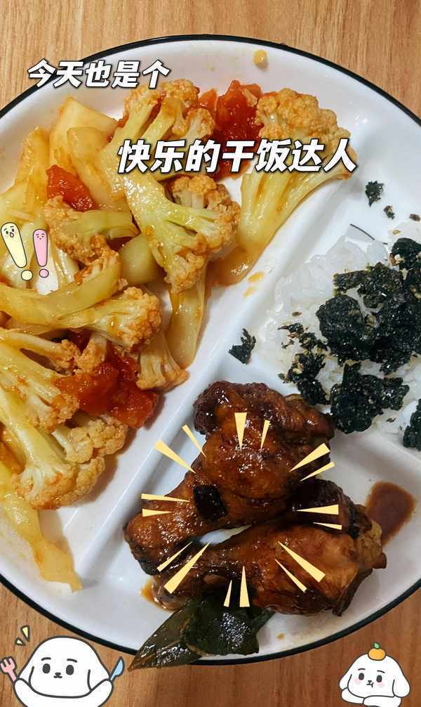 番茄菜花、红烧小鸡腿、米饭➕海苔碎。