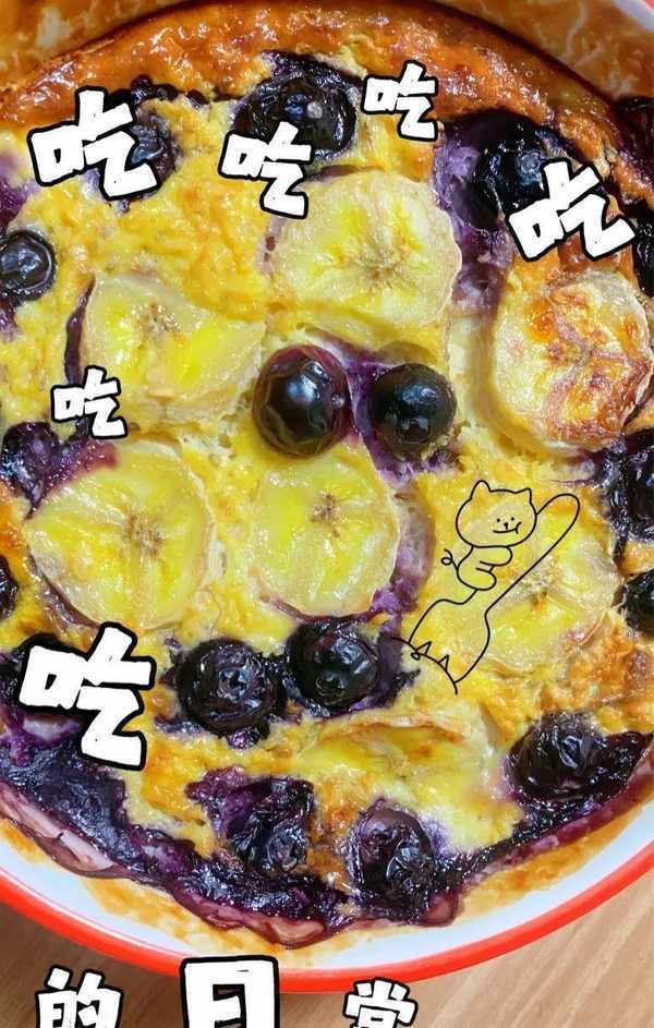 之前介绍过这个的做法,这里简单重复一下,放了燕麦片、鸡蛋一个、无糖酸奶一袋,香蕉一根,蓝莓数颗,搅在一起,烤箱烤180度,30分钟即可。