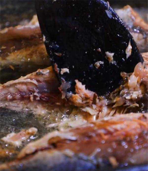 锅中放入食用油,要是家有猪油的在放一勺猪油,植物油和动物油放在一起吃起来会更香,等油热后将鲅鱼取出料渣放进去,给鱼肉煎碎取出鱼刺。