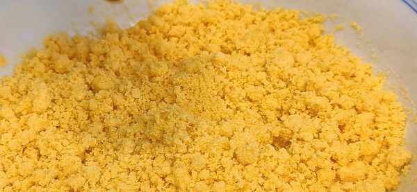 1.准备200克玉米面放入盆中,用100毫升开水烫面,一边倒一边搅拌,搅拌成面絮状。
