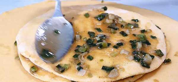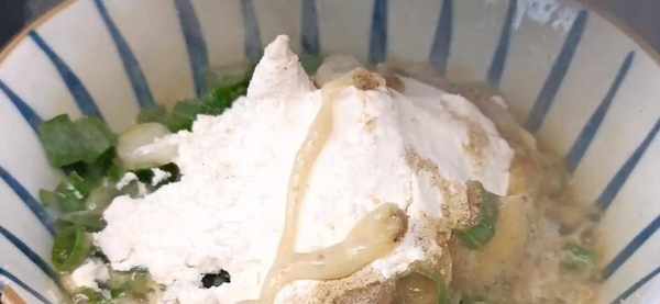 5.发酵时间做个葱油酥。切点葱花,多放一点,放入碗中。加入2勺子面粉,再调入盐跟十三香,最后淋入滚烫的热油,搅拌均匀即可。