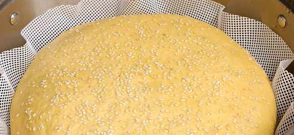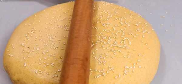 12.接着把它翻过来,表面撒点芝麻,再用擀面杖擀几下。