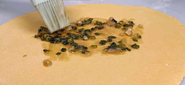 10.再把其他面片放在中间,放一张就在表面刷上一层油酥。知道全部做好,最后一层表面不用刷。