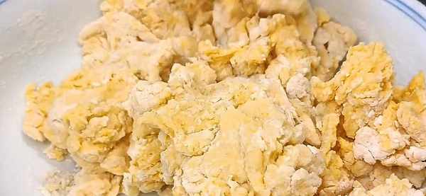 3.再往里面倒入200克左右的面粉,把它搅拌成面絮状。
