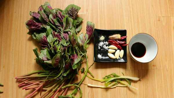 【烹饪食材】:红苋菜28克、大蒜5瓣、生姜1块、干红椒5个、食盐2茶勺、白砂糖半汤勺、鸡精1茶勺、蚝油1汤勺、香葱1棵、花生油2汤勺。