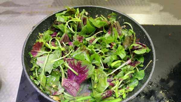 7、爆炒2分钟后把切好的红苋菜叶也倒进锅中,继续滑炒2分钟。