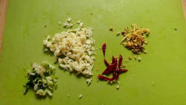 3、将大蒜、小葱和生姜切成碎末,干辣椒切丝即可。