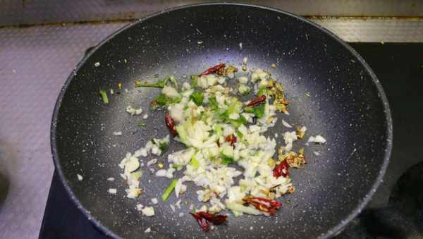 5、锅中出香味后继续加入大蒜末、葱花和切好的辣椒丝,继续小火煸炒2分钟左右。