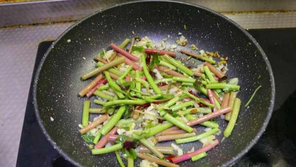 6、此时将小火转成大火,下入切好的红苋菜茎,大火翻炒至菜茎断生。