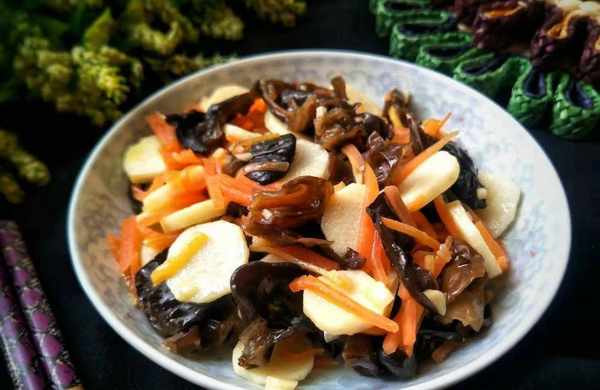 3.炒锅烧热放入食用油,油热后把准备好的葱花放进去炒香。然后放入准备好的山药和木耳。用大火翻炒出水分。里面加入白醋、精盐、白糖再次翻炒均匀就可以出锅食用了。