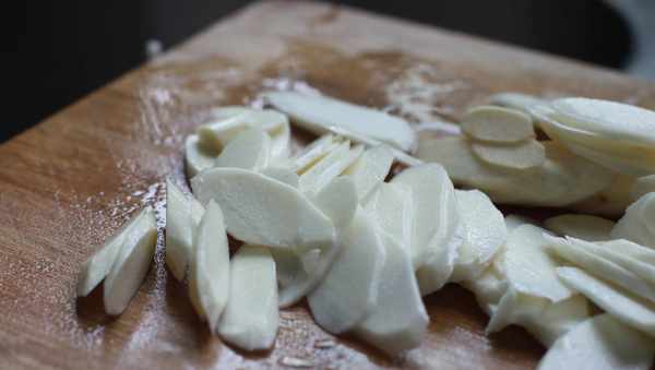 1.首先准备干木耳一小把放在清水中,给它浸泡半小时。铁棍山药两根给它去掉外面,我给它切成厚厚的薄片,放在清水中浸泡半小时。往里面加入少许的白醋,用这个方法处理好的山药不发黑。