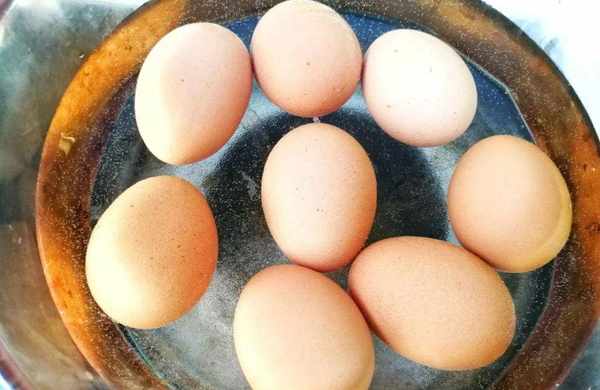 1.首先准备新鲜的母鸡蛋10个放入清水中给它冲洗干净,然后直接放入冷水锅内。盖上盖子大火烧开。水烧开后转中火煮沸15分钟后立即捞出。放入冷水中控晾。