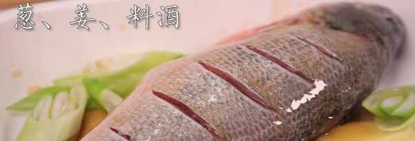 2、 葱切段、姜切片,放在鱼身上,加料酒,揉搓鱼身,腌制5分钟。